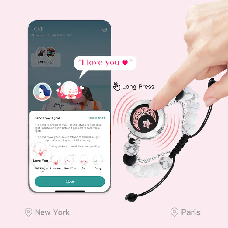 Unser neuestes Update führt eine Funktion ein, bei der ein längerer Druck ein „Ich liebe dich“-Signal aussendet. Darüber hinaus können Sie jetzt Ihren Verbindungsstatus in Echtzeit überprüfen. Berühren Sie einfach Ihr Armband. Wenn das Licht an bleibt, bedeutet dies, dass Sie verbunden und bereit sind.