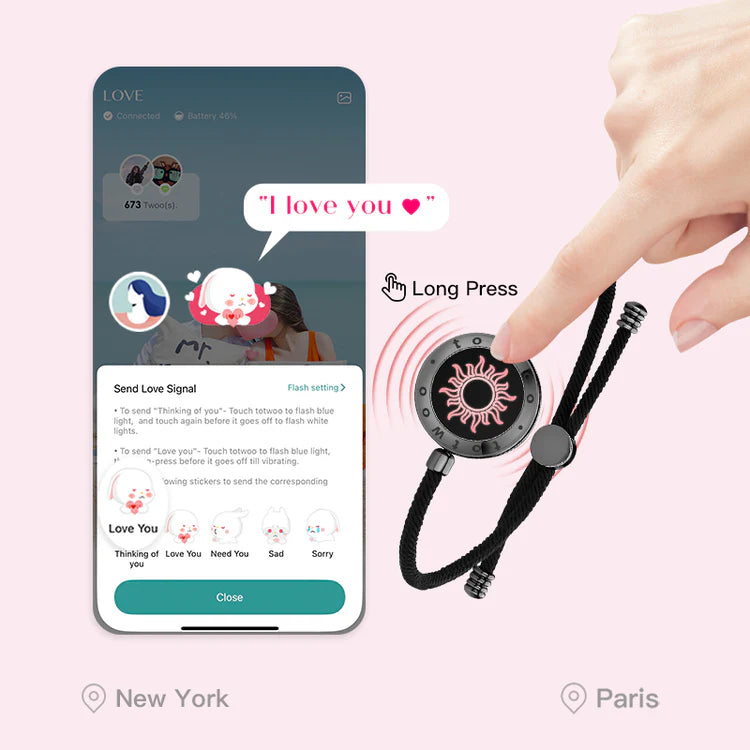Unser neuestes Update führt eine Funktion ein, bei der ein längerer Druck ein „Ich liebe dich“-Signal aussendet. Darüber hinaus können Sie jetzt Ihren Verbindungsstatus in Echtzeit überprüfen. Berühren Sie einfach Ihr Armband. Wenn das Licht an bleibt, bedeutet dies, dass Sie verbunden und bereit sind.