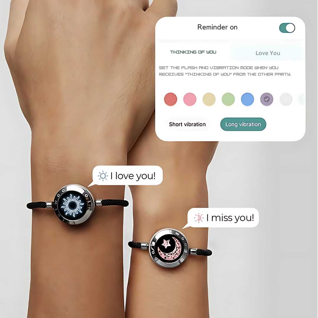 Bleiben Sie mit Ihrem Partner unabhängig von der Entfernung verbunden – mit unseren Fernberührungsarmbändern Sonne und Mond für Paare. Dieses Set enthält 2 Armbänder, die bei einer Berührung aufleuchten und vibrieren und Sie so auf einzigartige und besondere Weise einander näher bringen.