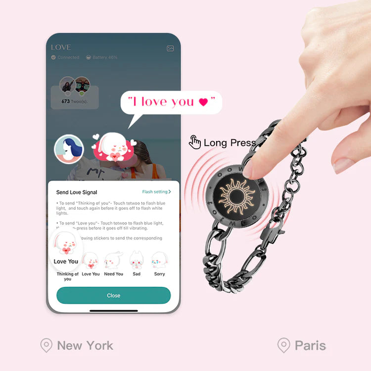 Wenn Sie Ihr Armband berühren, vibriert und leuchtet das Armband Ihres Partners und symbolisiert damit, dass Sie an ihn denken. Diese emotionale Verbindung überwindet Distanzen und sorgt dafür, dass Sie sich einander näher fühlen, egal wo Sie sind.