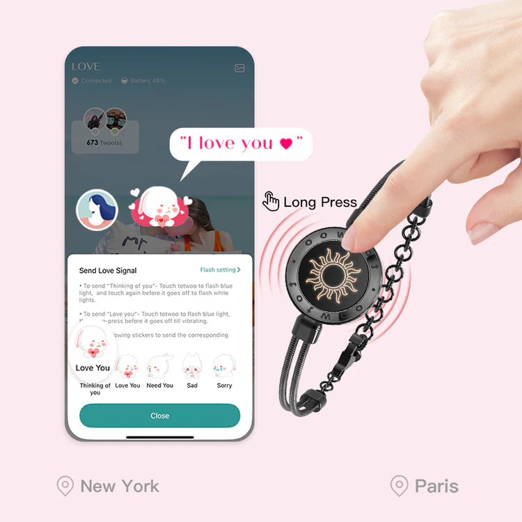 Unser neuestes Update führt eine Funktion ein, bei der ein längerer Druck ein „Ich liebe dich“-Signal aussendet. Darüber hinaus können Sie jetzt Ihren Verbindungsstatus in Echtzeit überprüfen. Berühren Sie einfach Ihr Armband. Wenn das Licht an bleibt, bedeutet dies, dass Sie verbunden und bereit sind.