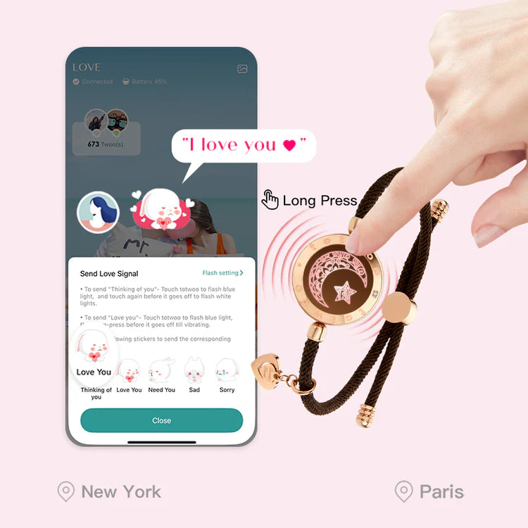 Auf Knopfdruck vibriert und leuchtet das Armband Ihres Partners, damit er weiß, dass Sie an ihn denken. Mit dieser einzigartigen Funktion können Sie die Anwesenheit des anderen spüren, auch wenn Sie meilenweit voneinander entfernt sind.